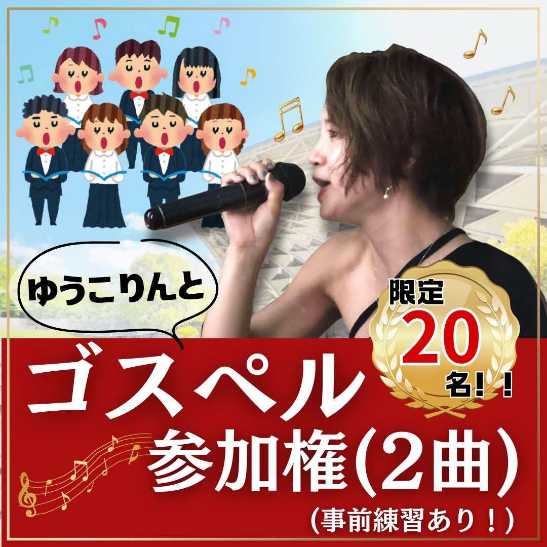 ゆうこりんが指導してくれるゴスペルレッスン付。みんなでステージにあがってゴスペルの大合唱をしませんか?ーー▶▷▶2曲の内どちらとも出演できますーー▶▷▶現地までの交通費、宿泊費等はご負担ください。